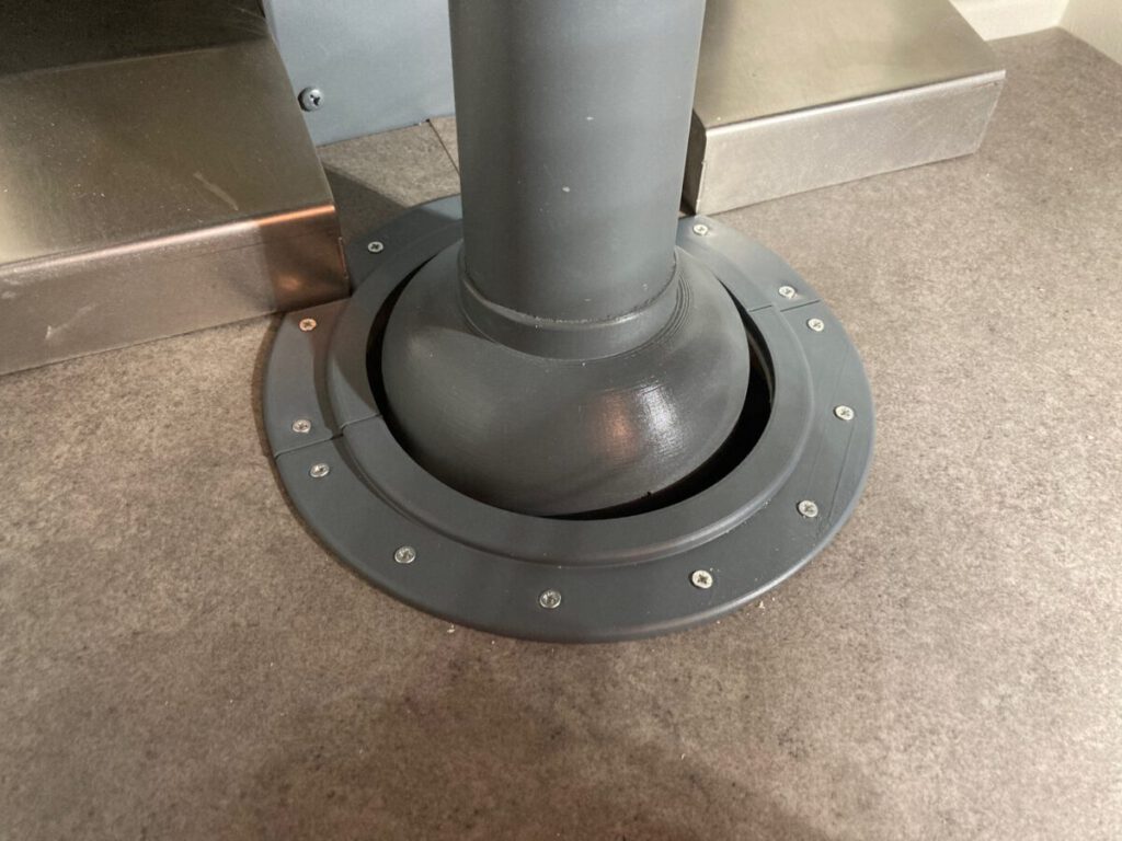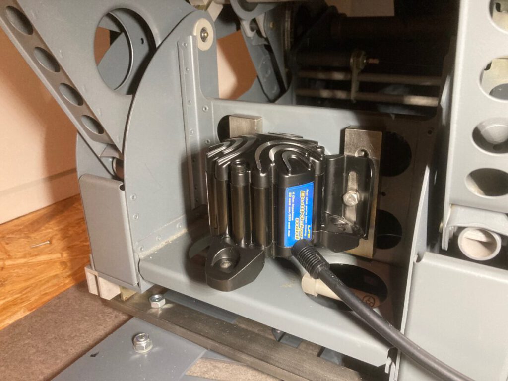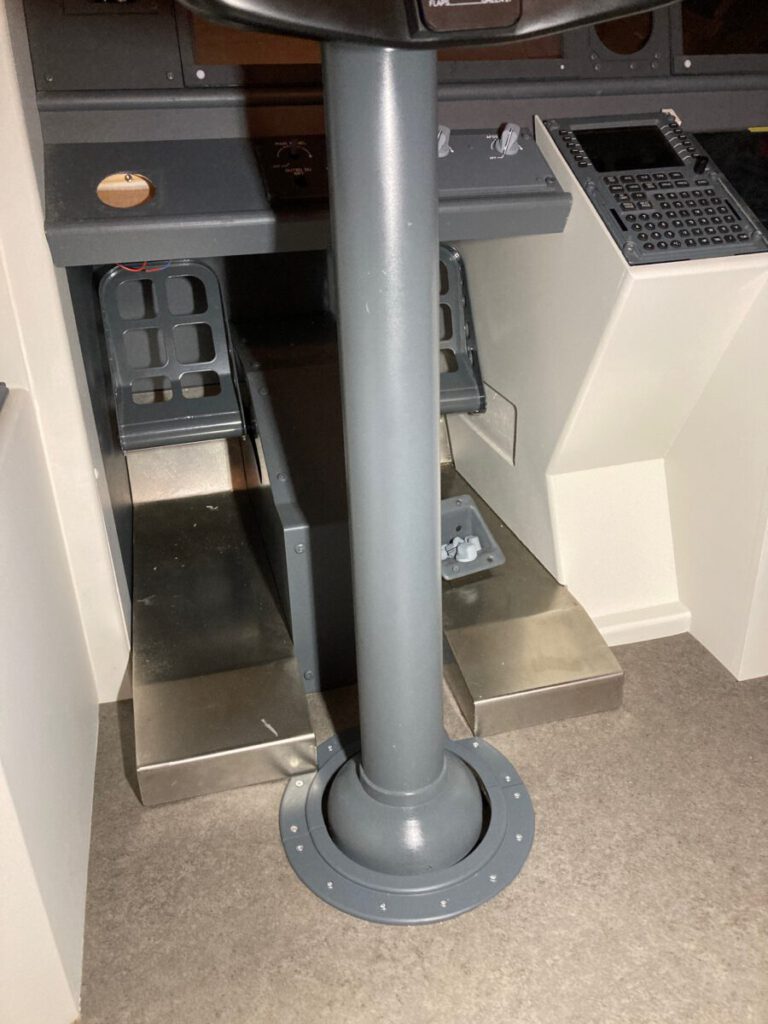 Nu de gemotoriseerde throttle quadrant klaar is wordt het tijd om de vloer netjes af te werken. Ik had nog een mooi stuk “aluminium” grijs linoleum over wat ik heb gebruikt om de vloer mee te bedekken. De gaten in de vloer rond de yoke kolommen heb ik afgewerkt met 3D-geprinte yoke mounts die uit 2 delen bestaan.