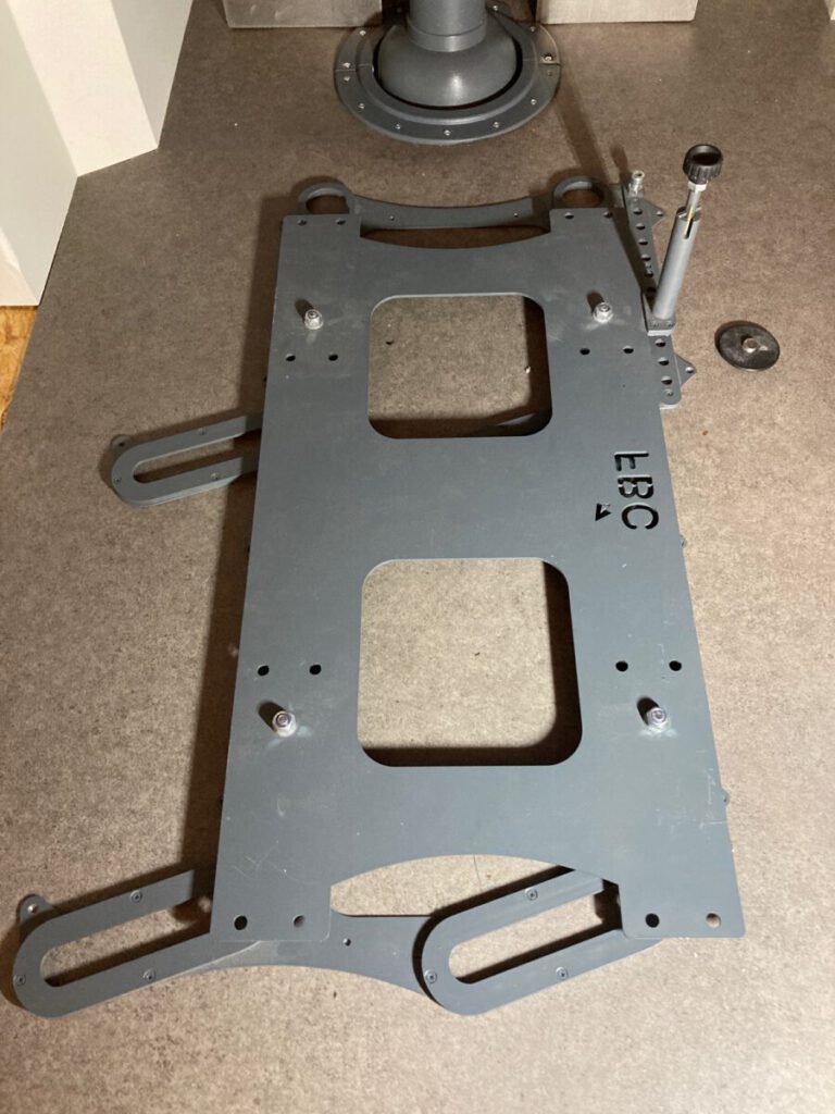 Om alvast wat te kunnen “testvliegen” heb ik aan de captainzijde de J-rails aangepast voor het monteren van mijn Ipeco captain seat. Dit betreft een originele Ipeco stoel (nieuw) die oorspronkelijk bedoeld was voor een Fokker 50. Deze stoel is geschikt voor originele J-rails maar ik maak gebruik van replica J-rails. Voor de captainzijde betreft dit een J-rail van FlybyCockpits. Deze heb ik destijds overgenomen. De Ipeco stoel is net wat breder dan de bovenste plaat van de J-rail dus heb ik 2 rechthoekige metalen staven gebruikt waarmee de stoel op de J-rail bevestigd kan worden met M8 schroeven.